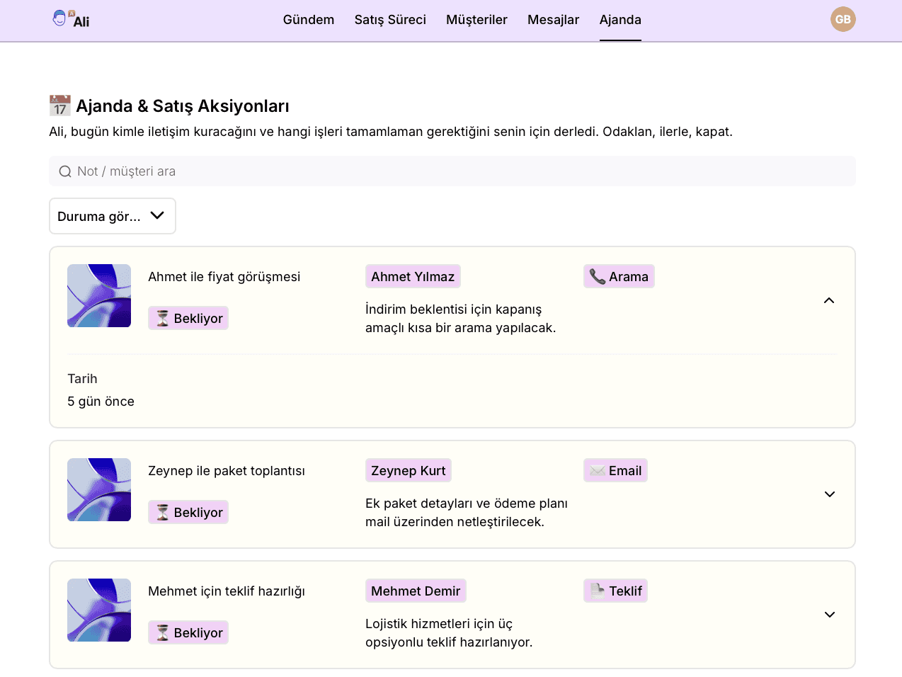 "Bugün kime, ne zaman teklif sunacağım, hangi işe nasıl yetişeceğim" baskısını unutun. Ali'nin Ajandası ve Satış Zekası size günün en verimli adımlarını söyler.