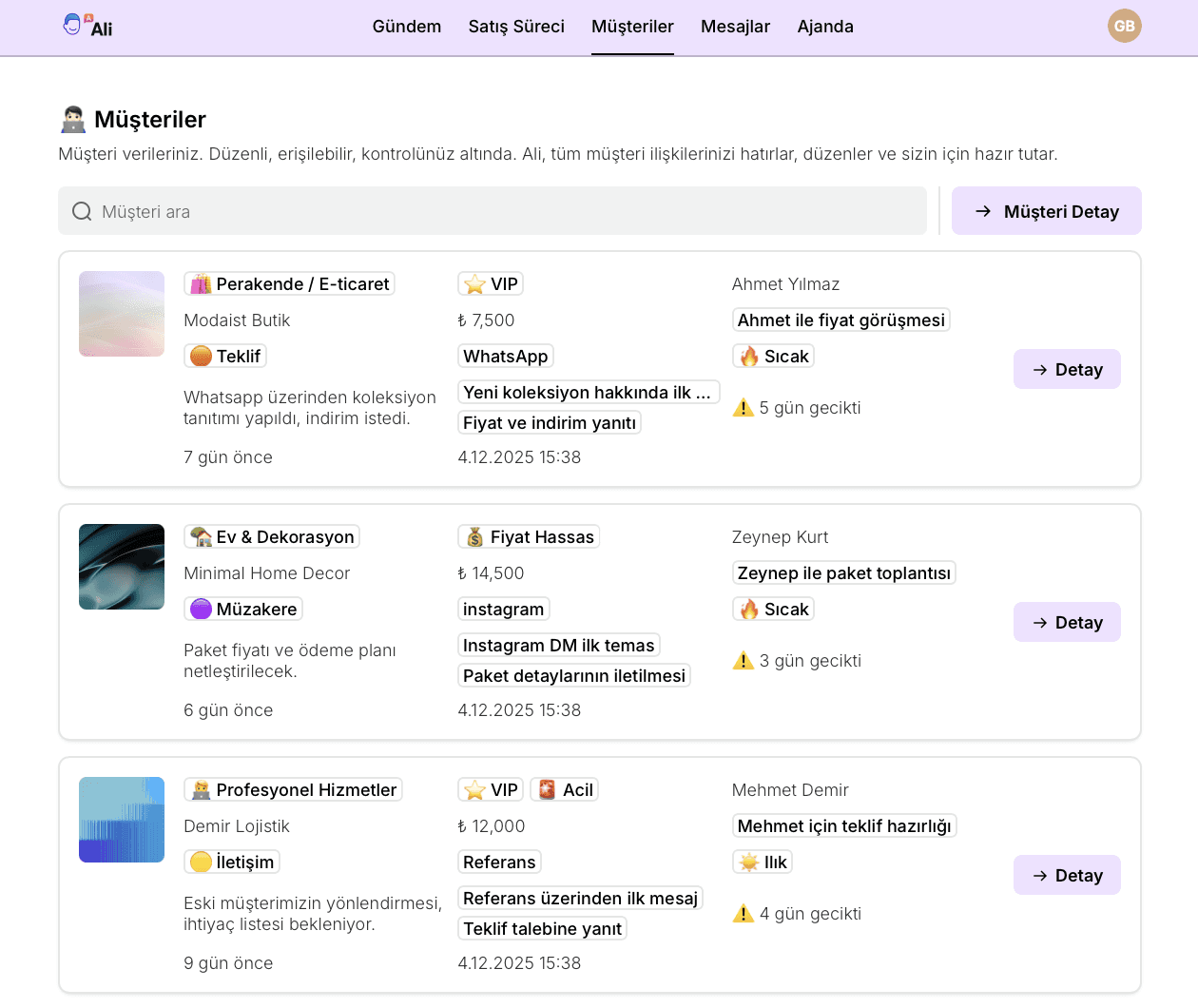 Ali, tüm müşteri taleplerini tek sistemde toplar. Müşteriler, mesajlar, satışlar — hepsi tek ekranda. Ali bir sistem değil, senin yapay zeka satış ekibin.
